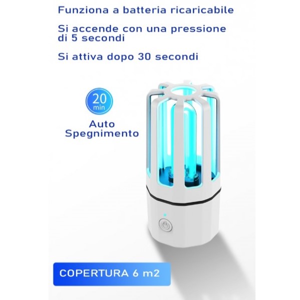 Grazie alla sua azione a 360° è in grado di disinfettare tutto ciò che desiderate, ma non è l'unica sua capacità infatti oltre ad un ampio raggio ha anche: funzionamento con batteria ricaricabile, è semplice e rapido da usare piochè si accende con una pressione di 5 secondi e si attiva dopo solo 30 secondi, inoltre è dotato di spegnimento automatico dopo 20 minuti garantendo una durata vitale della batteria efficente e sana.