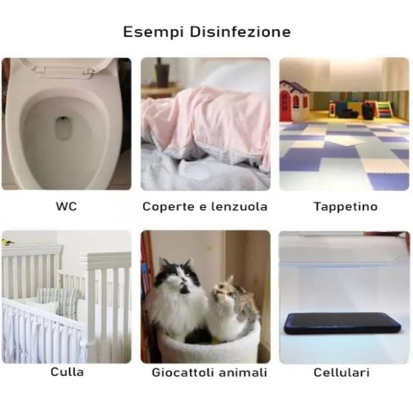 Questo sterilizatore universale e ciò che serve per mettere in sicurezza te e la tua famiglia, pratico, di design, piccolo ma con una grande raggio d'azione. Ideale per soggiorno, camera da letto, camerette, guardaroba e autoveicoli, disinfetta grazie ai raggi UV battericidi che emana: coperte e lenzuola, tappeti e tessuti, culle, cellulari, giocattoli di animali... Tutto in totale sicurezza per voi e i vostri cari!