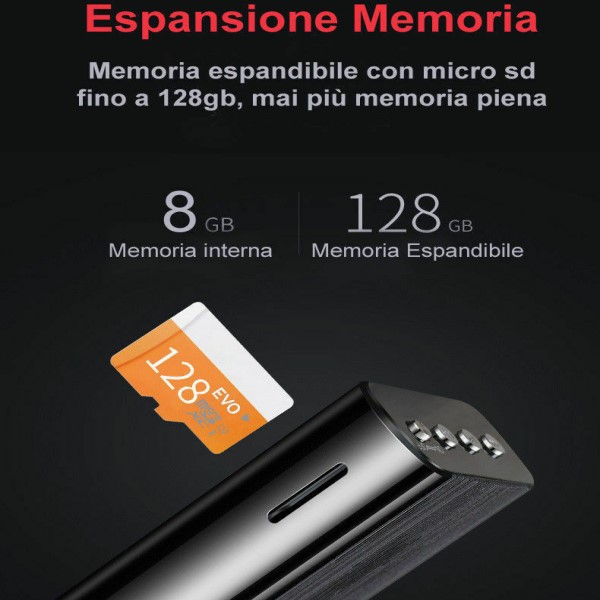 Il registratore ha una memoria integrata di 8gb, che garantisce circa 200 ore di registrazioni ma in caso di necessita' e' possibile inserire micro sd fino a 128gb.