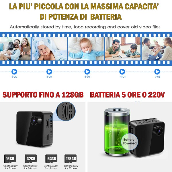 registrazione ovvero essendo compatibile con micro sd fino a 128gb permette di registrare ben 30 giorni, praticamente