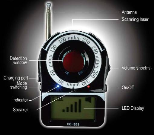 Questo rilevatore di microspie ha una duplice funzione: Rilevatore di qualunque segnale radio e rilevatore ottico di qualunque telecamera nascosta