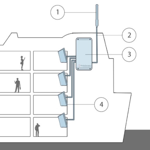 Quattro antenne interne a pannello sono collegate al ripetitore per barche e possono essere collocate in quattro posizioni distinte all’interno della nave. Un’antenna è collegata direttamente al ripetitore mentre le altre 3 antenne possono essere portate in altre zone della nave utilizzando i cavi SD240 in dotazione  (3 cavi da 15 m)