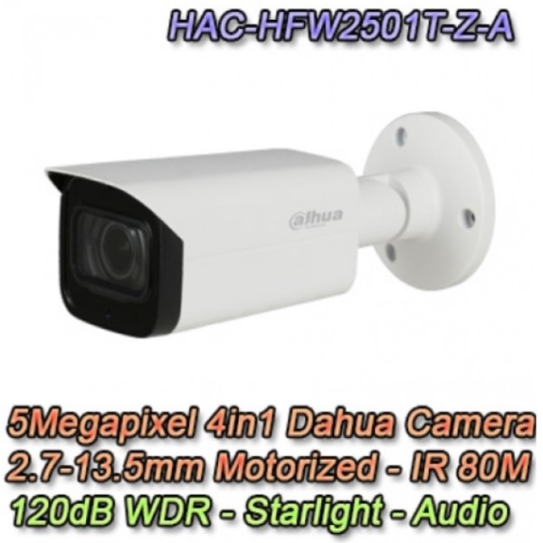 Telecamera Dahua da esterno HAC-HFW2501T-Z-A con 4 tecnologie in 1: HDCVI / HDTVI / AHD / ANALOGICA, risoluzione 5Megapixel 5MP, ottica 2.7-13.5mm motorizzata e sensore 1/2.8" CMOS con tecnologia Starlight. Illuminatore Smart IR fino a 80Metri, WDR 120dB, Day/Night (ICR), Ingresso Audio e Microfono, Uscita Video CVBS.