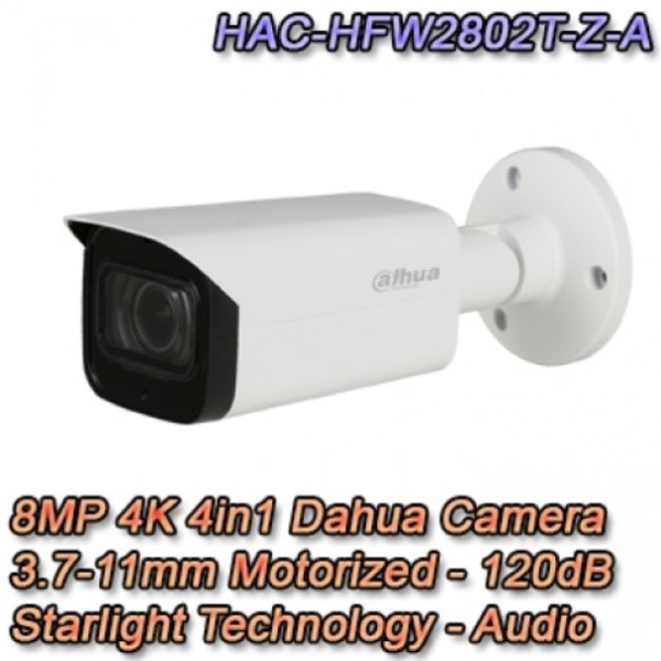 Telecamera Dahua da esterno HAC-HFW2802T-Z-A con 4 tecnologie in 1: HDCVI / HDTVI / AHD / ANALOGICA, risoluzione 8Megapixel 4K, varifocale 3.7-11mm con zoom motorizzato e sensore 1/2" CMOS con tecnologia Starlight. Illuminatore Smart IR fino a 80Metri, WDR 120dB, Day/Night (ICR), Ingresso Audio e Microfono, Uscita Video CVBS.