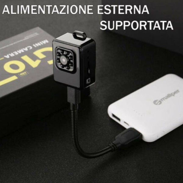 La telecamera essendo piccolissima e' progettata con una batteria tampone all' interno, e può essere alimentata con