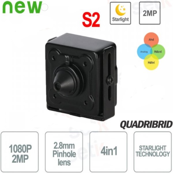 Mini telecamera Dahua da interno ideale per essere nascosta Serie S2, con 4 tecnologie in 1: HDCVI / HDTVI / AHD / ANALOGICA, risoluzione 1080P 2MP FULL HD, ottica fissa 2,8mm PINHOLE e sensore CMOS 1/2,8” con Tecnologia Starlight.  Day/Night, OSD, AGC, BLC, HLC, WDR 120dB. Dimensioni ridotte, metallo.