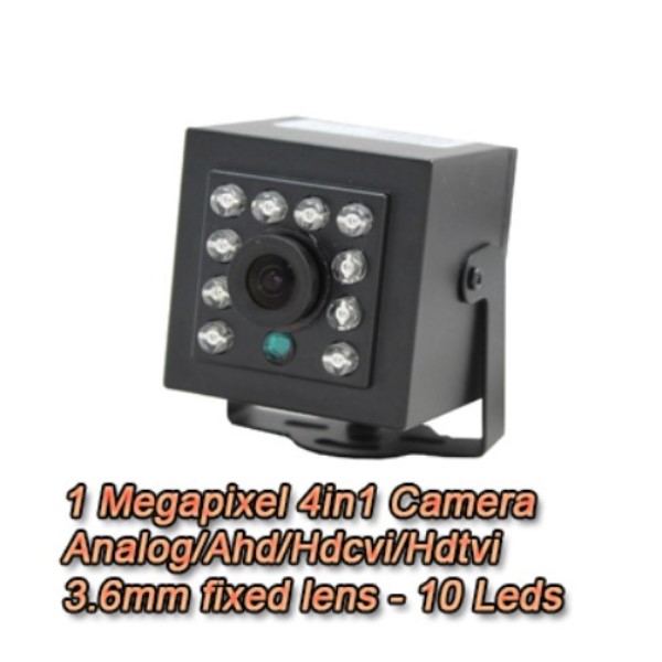 Telecamera per la videosorveglianza ibrida con 4 Tecnologie in 1 "Analogica/Ahd/Hdcvi/Hdtvi" con risoluzione 1MPX 720P, sensore d'immagine FH V20E+SOI H62 e ottica fissa 3.6mm. Equipaggiata di 10leds per una migliore visione notturna. Menù OSD con controllo tramite joystick, dimensioni ridotte 4cmx4cmx5cm, ideale per essere nascosta ovunque