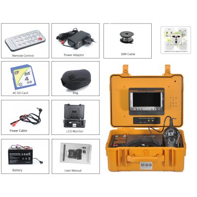 TELECAMERA SUBACQUEA TELECOMANDATA CON MONITOR A COLORI 7 POLLICI E VALIGETTA STAGNA, BATTERIA RICARICABILE, TELECOMANDO, TELECAMERA ROTORE 360°, CON DVR