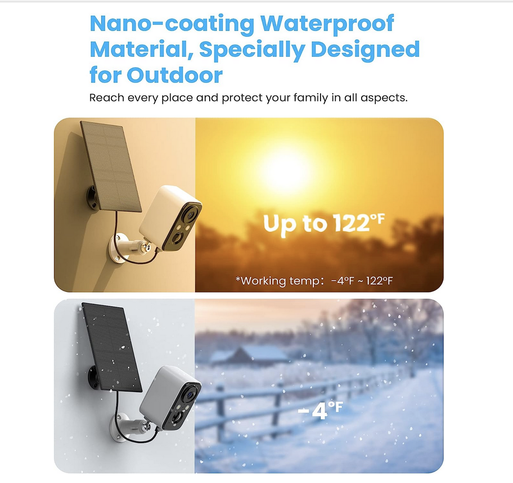 ?IP66 resistente alle intemperie e multifunzione?La nostra telecamera di sorveglianza è realizzata in materiale poliestere ad alto peso molecolare, che può resistere a tutti i tipi di intemperie e proteggere la tua famiglia in ogni momento. Inoltre, la videocamera dispone anche di una funzione di conversazione bidirezionale, che consente di parlare direttamente con la persona sotto la videocamera. Condividi con la tua famiglia, tieni d'occhio chi o cosa è importante.