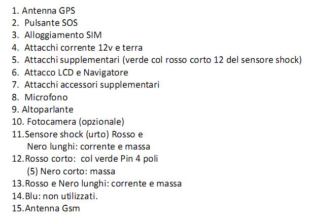 - Tracciamento veicolo in tempo reale, memorizzazione percorsi con scarico dal web sul prorpio pc, scatto foto istantanee dall'auto, con invio su interfaccia web e scarico su pc, dialogo con i passeggeri dell'automezzo, oppure semplice ascolto ambientale da qualsiasi telefono del mondo. Allarmi in caso di superamento del limite di velocità impostato, urto del veicolo, uscita zona preimpostata, apertura portiere, luci accese. Altri allarmi ed azioni sono possibili mediante i cavi in dotazione.